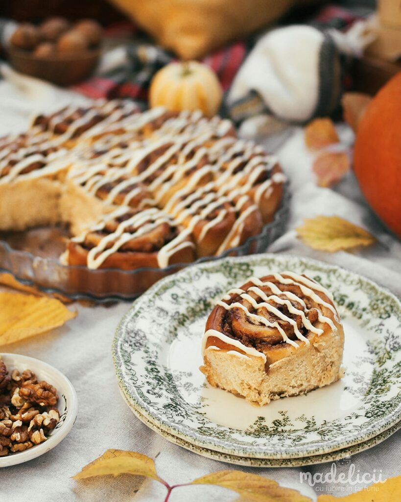 Iar cireasa de pe tort cinnamon rolls? O glazura fina de crema de branza vanilata, care se topeste usor pe rulourile fierbinti. Gustul bogat si usor acrisor al cremei de branza echilibreaza perfect dulceata caramelului si a merelor. In plus, poti pune cateva lingurite de caramel sarat si peste glazura cu crema de branza pentru si mai multa savoare.