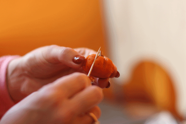 Tot ce ai de facut este sa pregatesti un blat de tort cu piure de dovleac si condimente. Cand se raceste, il vom faramita si vom amesteca cu putin unt si crema de branza. Daca ai prin frigider mascarpone, poti folosi in locul cremei de branza. Vom obtine astfel un „aluat” din care vom forma dovleceii, iar in mijloc vom ascunde o supriza: o aluna de padure. Odata ce punem in frigider, datorita untului si cremei de branza, se vor intari.