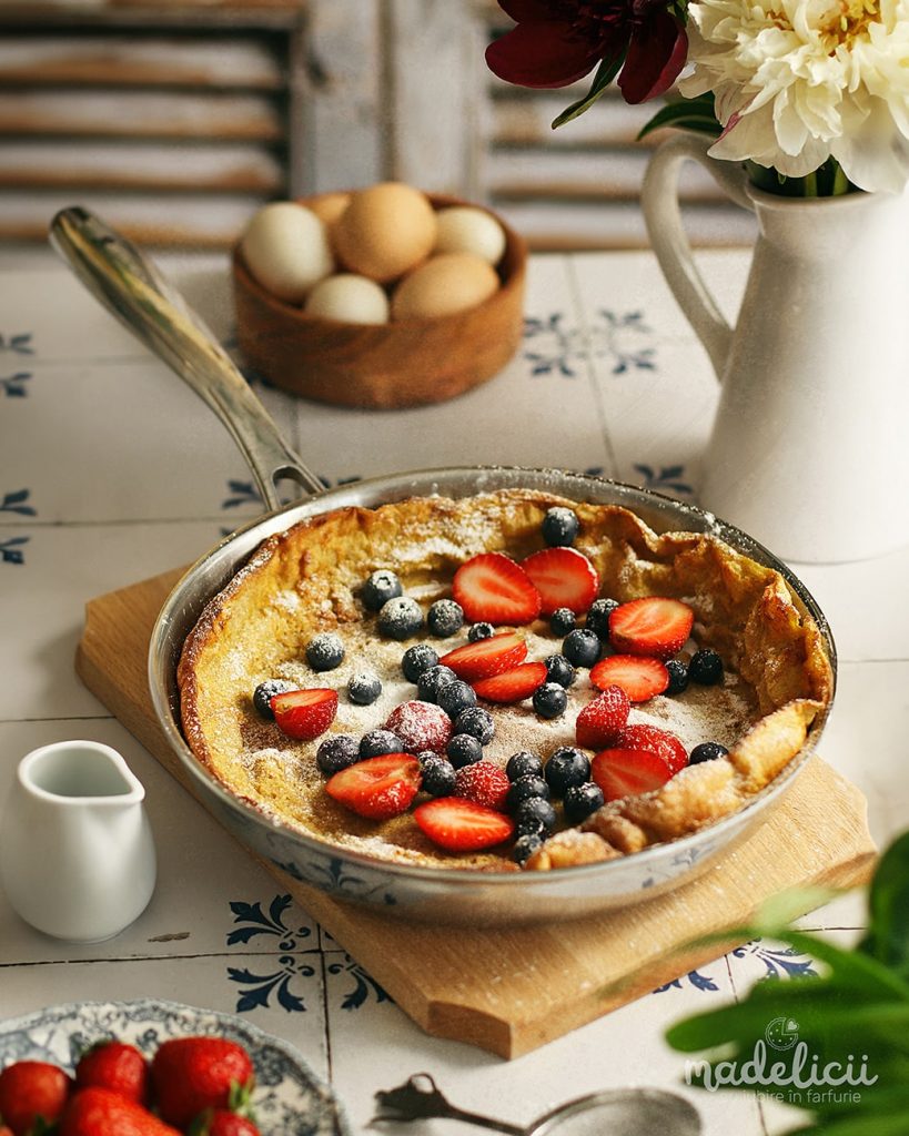 Daca iti plac clatitele, dar nu ai chef sa stai langa aragaz, prajind una cate una, atunci trebuie neaparat sa incerci clatita la cuptor Dutch Baby. Se face din cateva ingrediente simple, pe care le ai mereu in casa – oua, lapte, faina – si, spre deosebire de clatitele clasice sau de pancakes, o dai direct la cuptor si o uiti acolo pentru 12-15 minute. E genul acela de reteta care iti face diminetile mai usoare si mai delicioase.