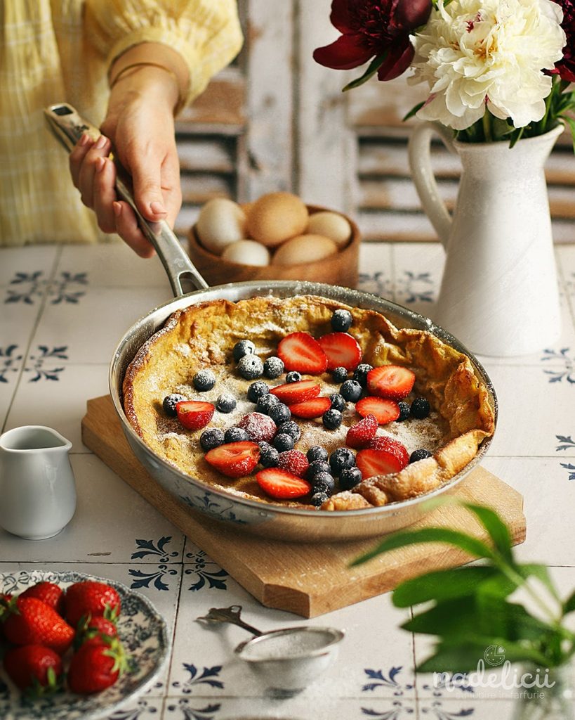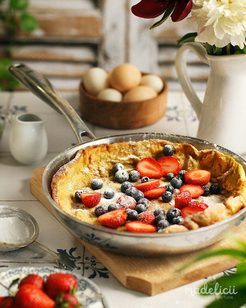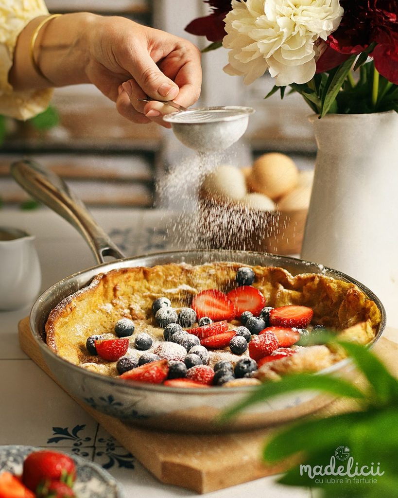 Fie ca o faci pentru tine intr-o dimineata linistita sau ca vrei sa-ti impresionezi musafirii cu ceva inedit, aceasta clatita la cuptor Dutch Baby va deveni cu siguranta una dintre retetele tale preferate. Simplu de facut, versatila si cu un gust minunat – ce-ti poti dori mai mult? Daca o incerci, spune-mi in comentarii cum ti-a iesit si nu uita sa urci o fotografie pe Instagram, cu tag @madelicii.