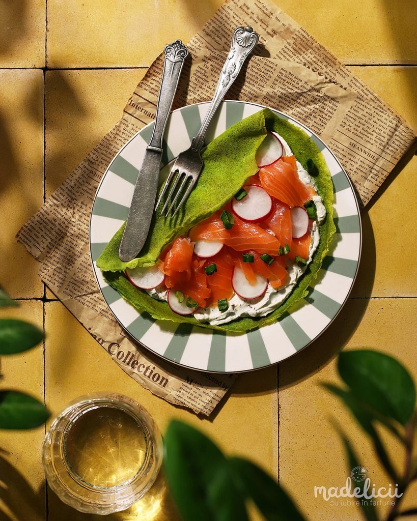 Cine nu iubeste clatitele? Sunt atat de versatile, gata sa se transforme din desert in gustare sarata intr-o clipita. Iar astazi iti propun un twist gustos si colorat al clatitelor clasice: clatite cu spanac umplute cu somon, crema de branza, ridichi si ceapa verde. O combinatie care cucereste prin arome, textura si culoare, perfecta pentru un mic dejun consistent, un pranz rapid, o cina usoara sau chiar o gustare speciala atunci cand ai musafiri.