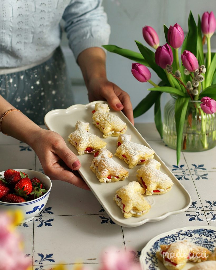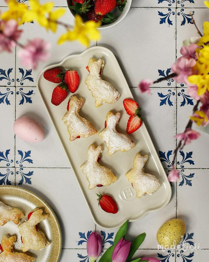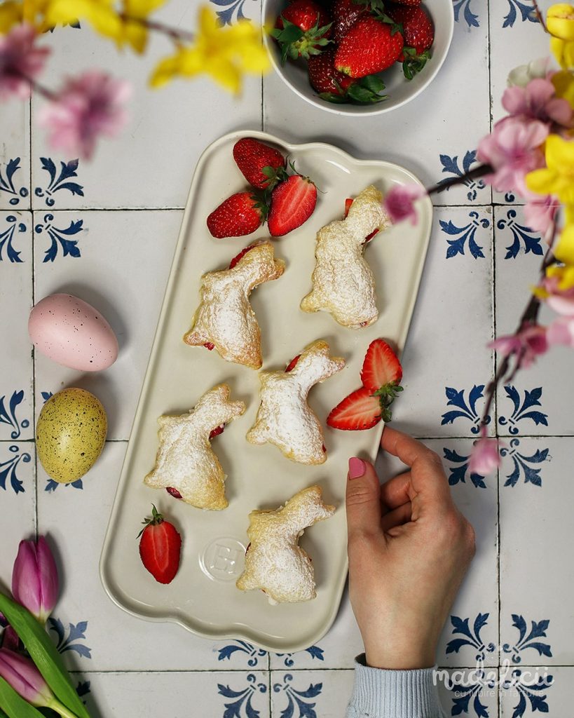 Dar sa stii ca nu trebuie sa astepti Pastele ca sa le faci. Sunt ideale si pentru o zi obisnuita in care ai pofta de ceva dulce si usor, pentru un brunch de weekend, o aniversare in familie sau o petrecere in aer liber. Le poti face chiar si cu cei mici – vor adora sa decupeze iepurasii din aluat si sa-i umple cu frisca si capsuni.