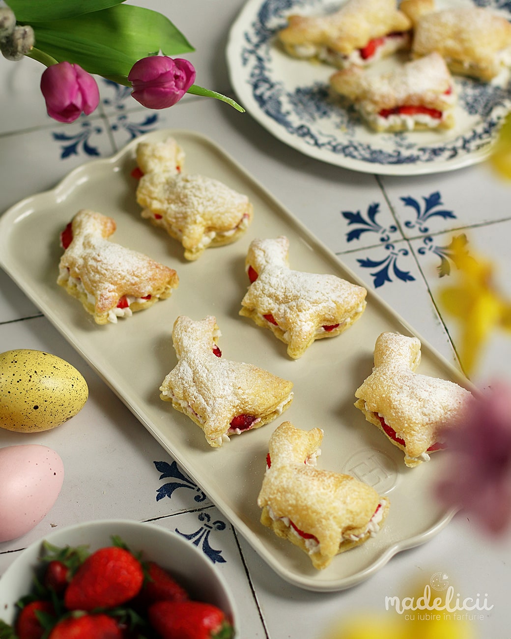 Dar sa stii ca nu trebuie sa astepti Pastele ca sa le faci. Sunt ideale si pentru o zi obisnuita in care ai pofta de ceva dulce si usor, pentru un brunch de weekend, o aniversare in familie sau o petrecere in aer liber. Le poti face chiar si cu cei mici – vor adora sa decupeze iepurasii din aluat si sa-i umple cu frisca si capsuni.